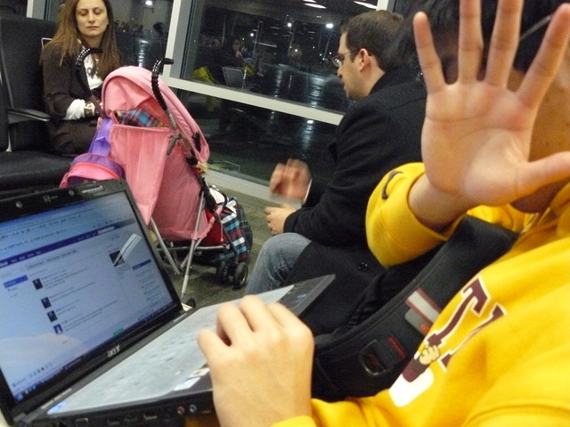 我們三點二十分的飛機,四點四十飛才起飛,五點半抵達Cedar Rapids。我們下一班飛機時間是六點十分起飛,五點四十五分登機,我跟我弟都為了要找下一個登機門很緊張,我們的作戰計畫是他負責領兩件首題型哩,我負責出去找看版,找下一個登機門。怎知道,我走出飛機沒看到任何一個轉機看板,連我弟都領了行李出來我還沒找到一個可以看登機門的看板,只好跟著大家走。走沒一百公尺就遇到了出關的point,怎麼會這樣=口=?! 一旁的警察跟我說往回走,大概是登機門C1或C3。登機門C1在我們原本走出來的登機門的隔壁,C3在對面,原來這個機場如此的小,居然不到十個登機門!!!!!!!! 原本以為很趕的局面頓時變得很優閒,而且這個機場還很Friendly的有免費無線網路,给他五顆星。