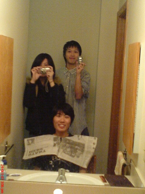 師姐幫我在地板上舖了報紙跟剪了個可以放頭的報紙洞幫我剪頭髮!!!